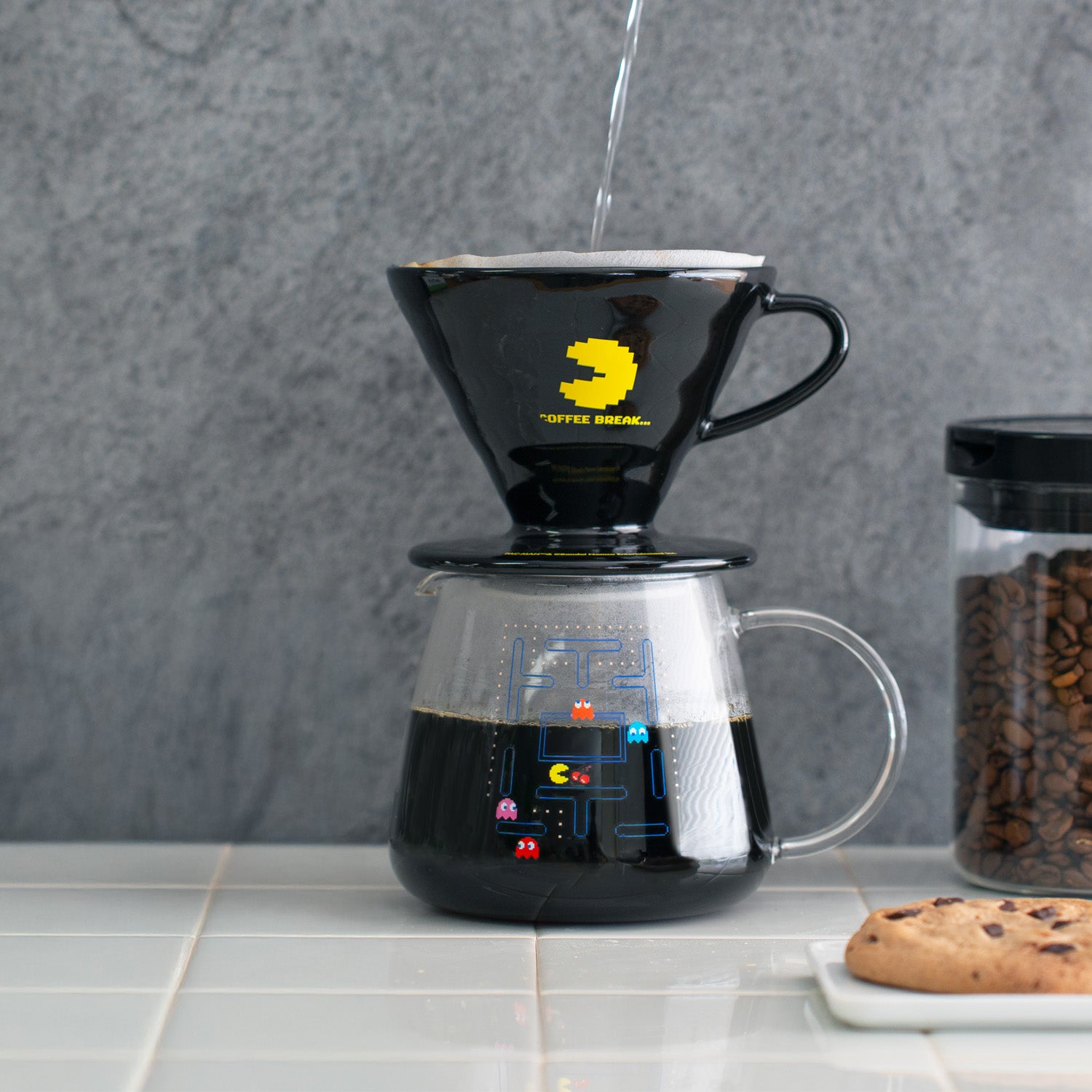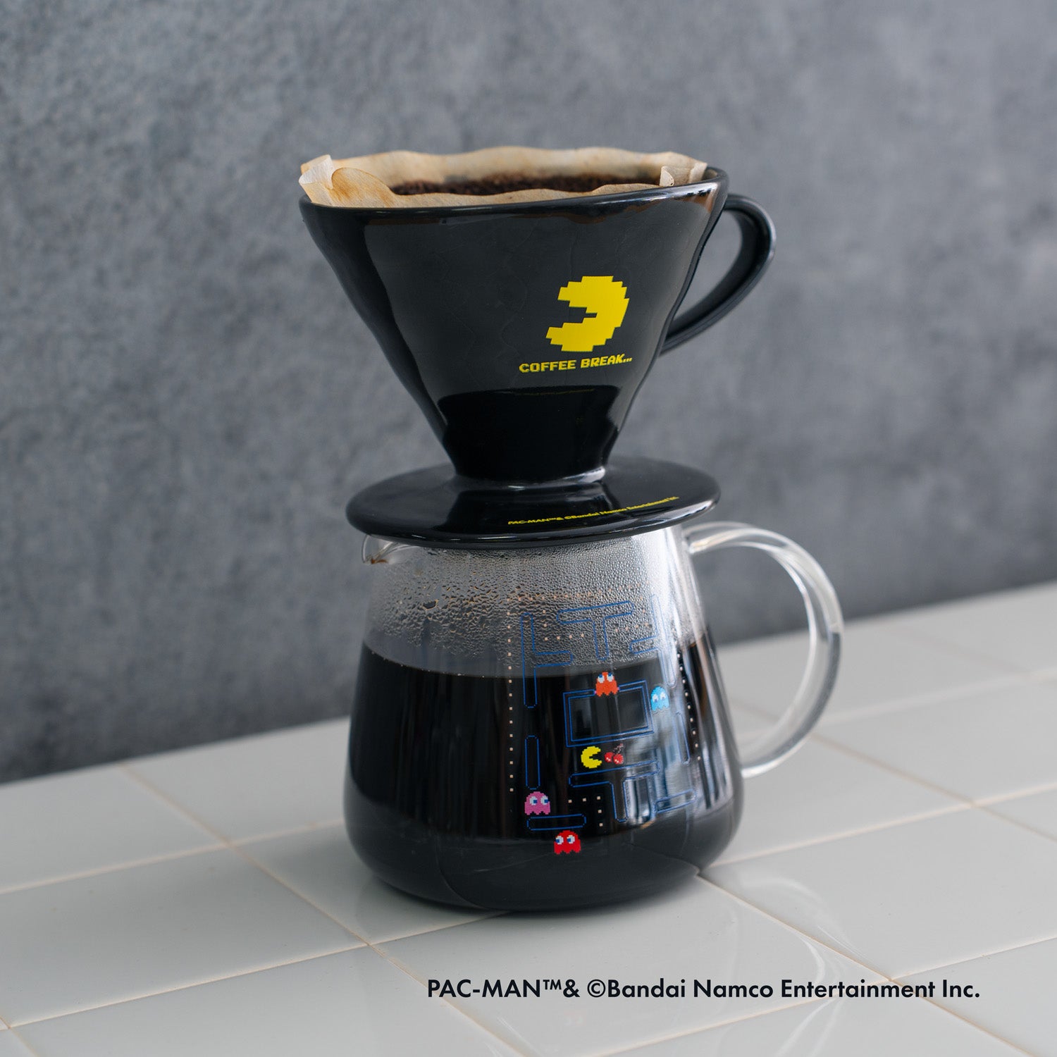 The keywords that connect coffee and PAC-MAN are “black background” and “COFFEE BREAK.” When you brew coffee with the dripper and server, the coffee itself becomes the black background, making it look like a game screen. The dripper is printed with, “COFFEE BREAK,” linking the game’s pause scene with coffee time.