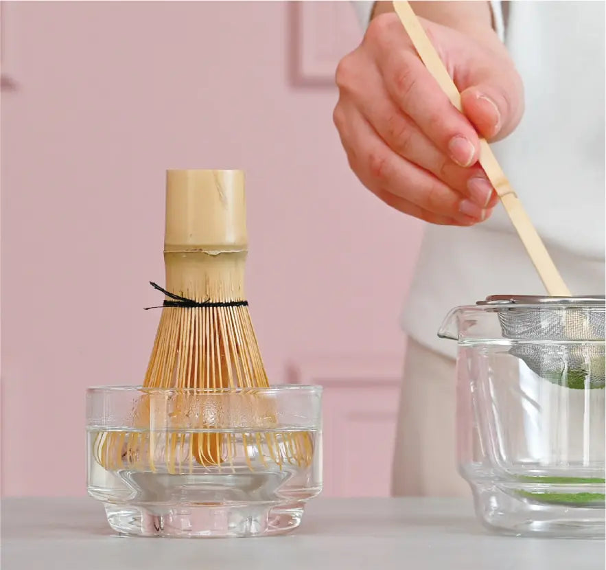 - Place the chasen inside the stand and let it sit for a moment to bloom. This step helps soften the bristles and prepares the chasen ensuring optimal performance when whisking the matcha.